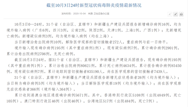 ¹ú¼ÒÎÀÉú½¡¿µÎ¯ÓÚ½ñÈÕ·¢²¼µÄ¡¶½ØÖÁ10ÔÂ3ÈÕ24ʱÐÂÐ͹Ú×´²¡¶¾·ÎÑ×ÒßÇé×îÐÂÇé¿ö¡·£¨ÒÔϼò³Æ¡°Çé¿ö¡±£©Ìá³ö£¬10ÔÂ3ÈÕ0¡ª24ʱ£¬31¸öÊ¡£¨×ÔÖÎÇø¡¢Ö±Ï½ÊУ©ºÍн®Éú²ú½¨Éè±øÍű¨¸æÐÂÔöÈ·ÕﲡÀý16Àý£¬¾ùΪ¾³ÍâÊäÈ벡Àý£¨¹ã¶«6Àý£¬ËÄ´¨3Àý£¬ÔÆÄÏ2Àý£¬ÉÂÎ÷2Àý£¬Ìì½ò1Àý£¬ÉϺ£1Àý£¬¹ãÎ÷1Àý£©£»ÎÞÐÂÔöËÀÍö²¡Àý£»ÐÂÔöÒÉËÆ²¡Àý3Àý£¬¾ùΪ¾³ÍâÊäÈ벡Àý£¨¾ùÔÚÉϺ££©¡£µ±ÈÕÐÂÔöÖÎÓú³öÔº²¡Àý10Àý£¬½â³ýҽѧ¹Û²ìµÄÃÜÇнӴ¥Õß272ÈË£¬ÖØÖ¢²¡ÀýÓëǰһÈÕ³ÖÆ½¡£